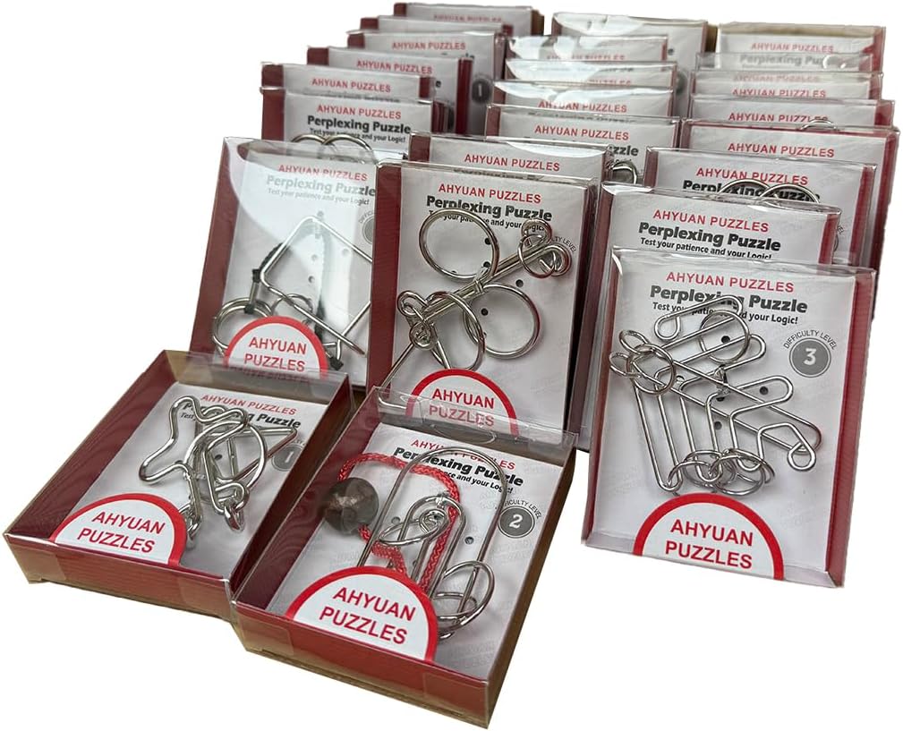 AHYUAN 24 Packs Large Metal Puzzles Brain Teaser IQ Wire Puzzles with Individual Backside Solution Paper Box Gift Package Educational Puzzle Games Toys Magic Trick Toy Party Favors for Kids Adults