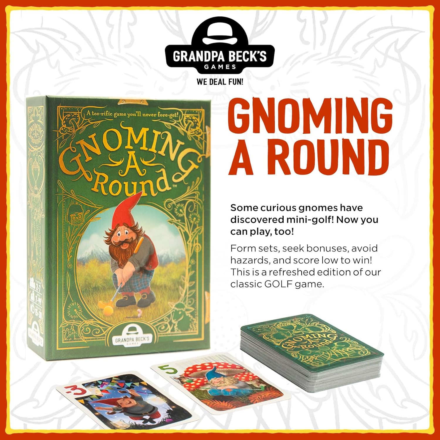 - A TIMELESS CLASSIC REINVENTED: Join the gnomes in this light strategy game inspired by the classic card game Golf. In the game, the player with the lowest score wins, just like in mini-golf! You'll each begin the game with 9 face down cards. Lower your score by collecting negative cards or by forming rows of positive cards of the same value in rows of 3 of a kind to flip their score. Watch out for hazards like the water trap. Great for kids, teens, and adults alike again and again.
