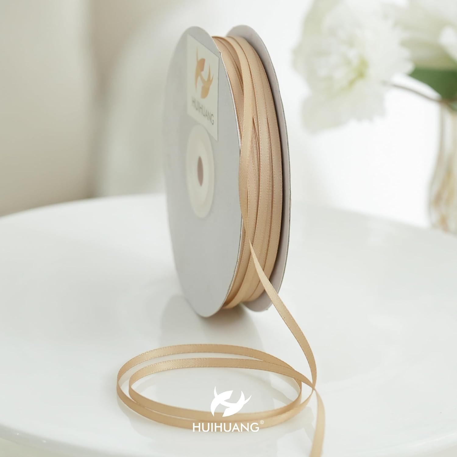HUIHUANG Champagne Satin Ribbon 1/8 inch x Continuous 100 Yards Roll Tan Color Double Face Ribbon for Crafts, Wedding Invitation Card, Gift Wrapping, Christmas Ornaments, Gift Tag