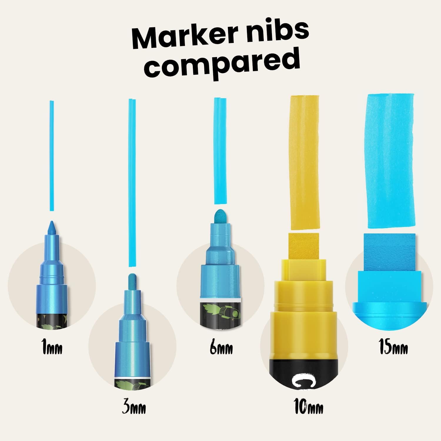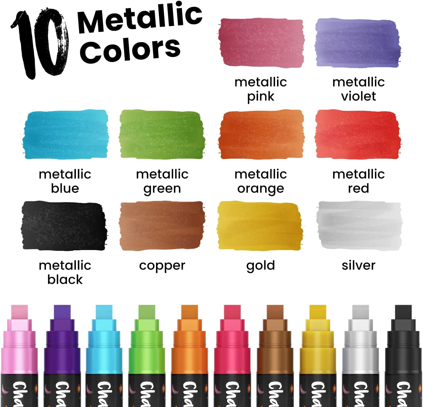 - 10 Sparkling Metallic Colors - Our new Vibrant Metallic chalk pen colours. Each set comes with the dazzling Gold, Silver and Copper bronze marker. Use them on arts and craft paper, hand & chalk lettering, stencils