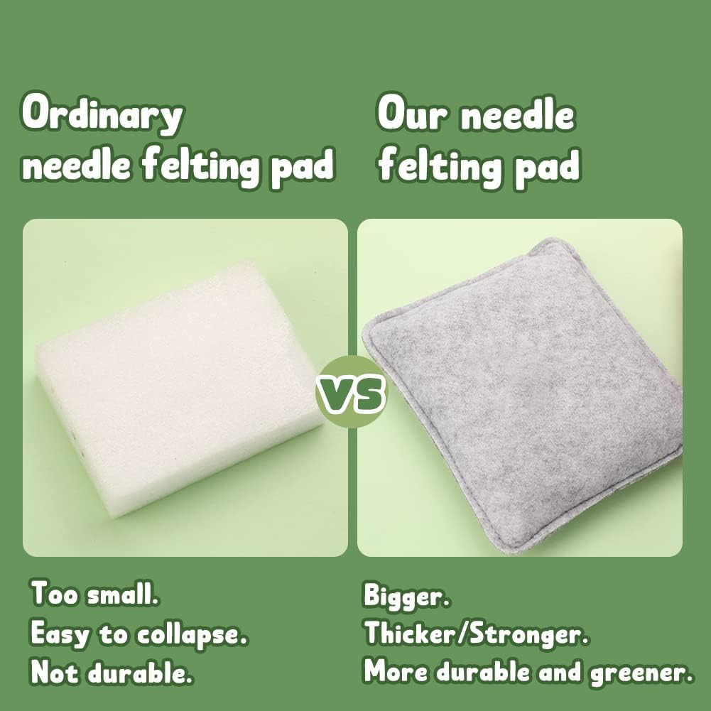 - Better Needle Felting Pad: In order to make your felting starter kit better, we provide you with larger and thicker felting pads. Our needle felting pad is made of soft felt and upgraded sponges. Our test found that this needle felting mat is stronger than a foam mat and does not collapse easily. Can be recycled multiple times. More green. Worry-free needle felting, free your hands.