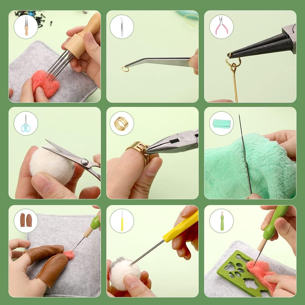 - The wool felt molds allow you felting cute crafts in different shapes. The oil wiping cloth allows you to wipe the protective oil on the felting needles. Of course, there are a series of necessary needle felting supplies such as awl, scissor, tweezers, jump rings tool opener, dust plug, phone lanyard, finger cot, plastic nose, plastic eyes, wooden felting handle, wooden felting handle with 8 needles, 9-shape needle, T-shape needle, etc.
