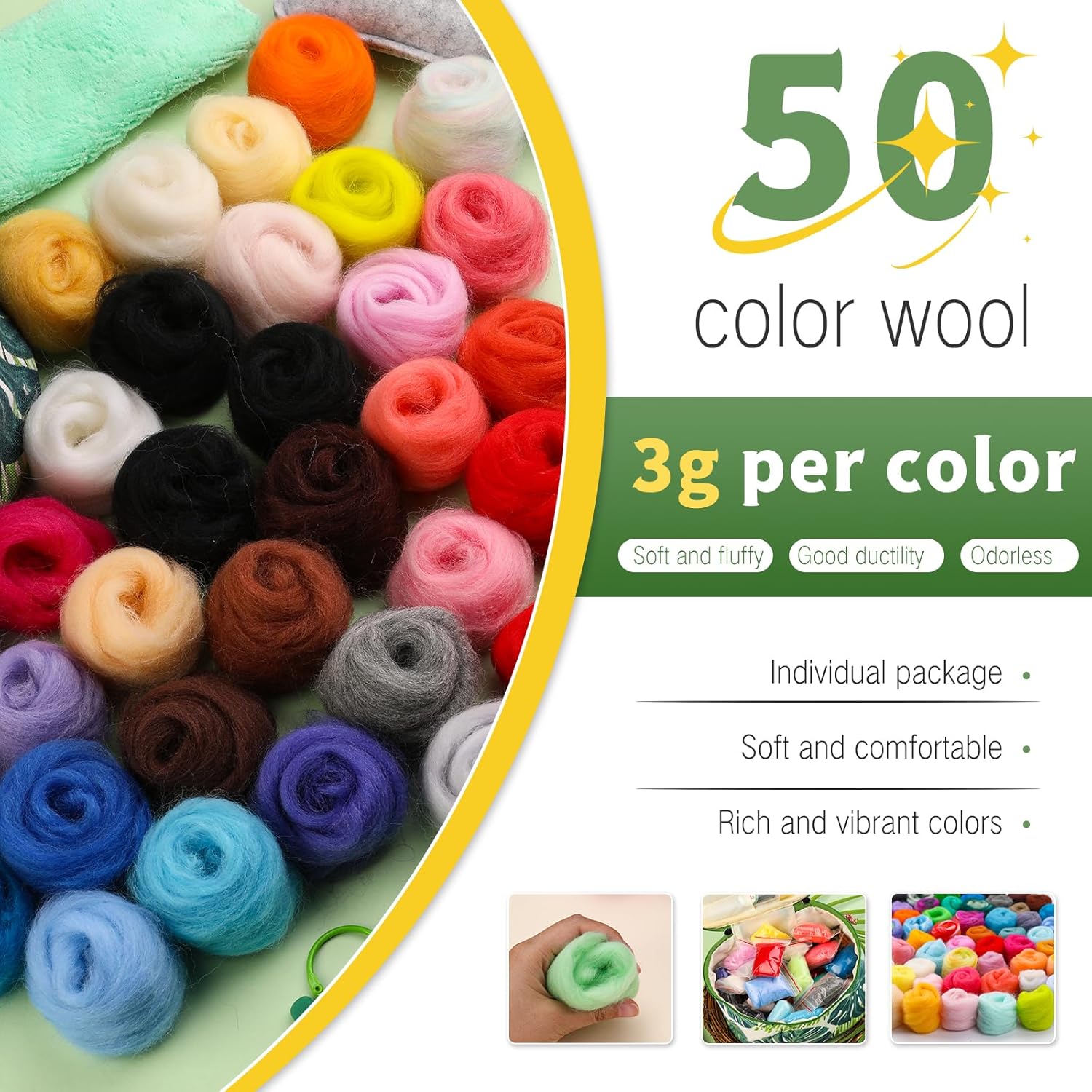 - Rich Needle Felting Wool Roving: 50PCS high-quality natural wool roving fiber, 3 grams per pack. Felting wool made of soft and fluffy felting fiber wool, has an exquisite texture with no caking, soft, bright colors, suitable for needle felting. We have increased the grams of the most commonly used colors, like green, white, red, and black to meet your needs.