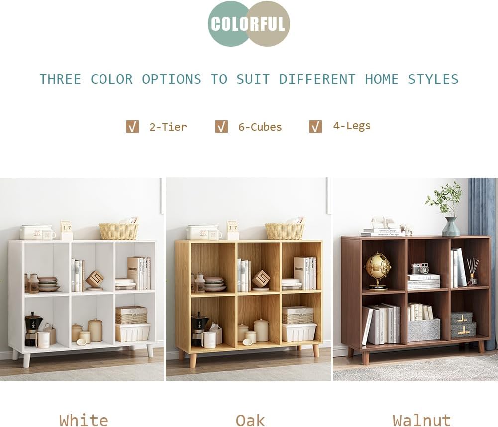IOTXY Freestanding Open Cubes Bookcase - 2-Tier Floor Standing Wooden Storage Display Cabinet Organizer with Legs for Home Office, 6-Cubes Open Shelf Low Short Bookshelf, Oak