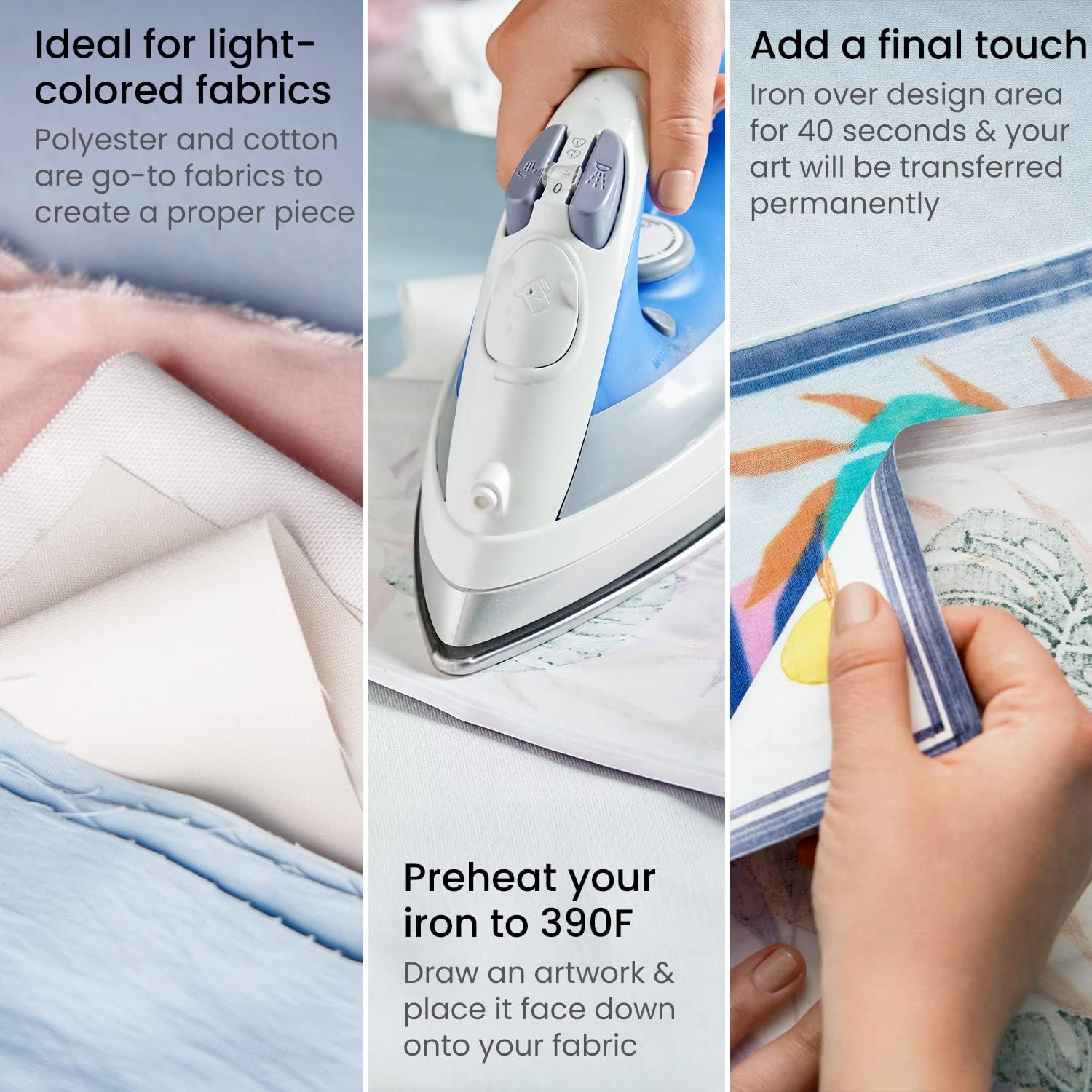 - Heating up Your Artwork: These vibrant colored iron on transfer pens will add pizzazz to craft projects. With their fine-tip for easy control, these fabric pens allow you to draw detail into your designs. Heat temperature is 390 °F (200 °C), 40 sec.