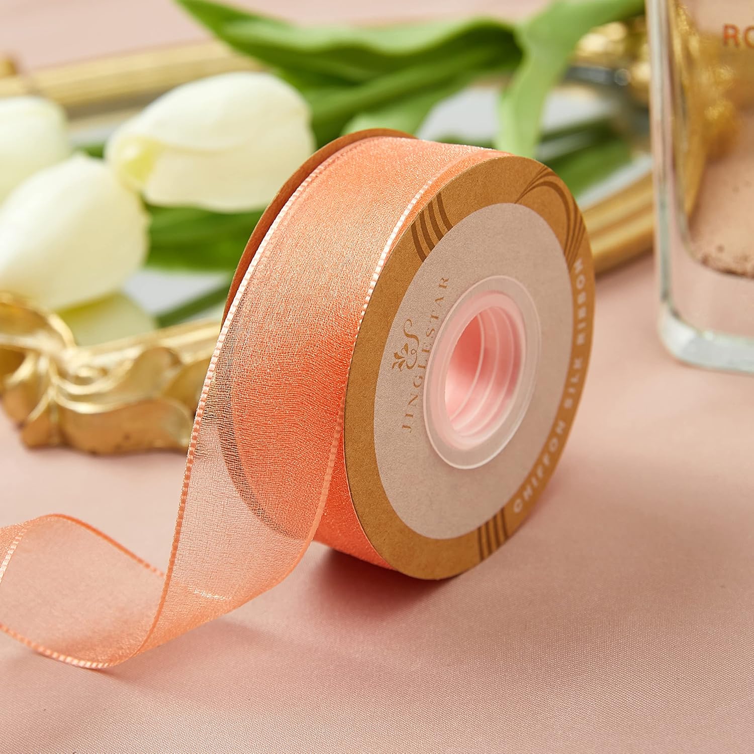 1 Inch Wide Sheer Chiffon Ribbon - Pearl Silk Woven Ribbon Suitable for Gift Wrapping, Wedding Decor, Home Decor, Girl Hair Accessories Handmade DIY (25 Yards/roll) (Tangerine)