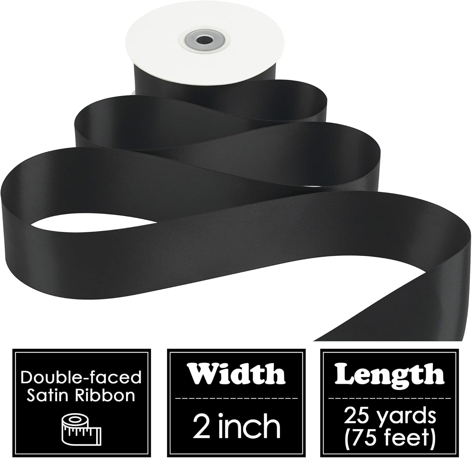 - Size: Black ribbon is 2" wide and continuous 25 yards(75 ft) long in a paper box. Perfect size for various decoration and crafts, such as decoration for party, flower bouquet, gift wrapping, indoor and outdoor decor and all ribbon crafts making