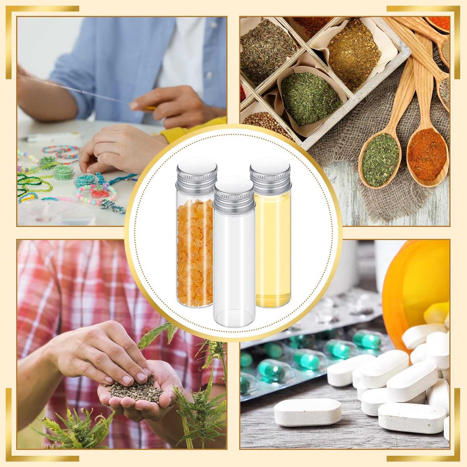- Package Includes: the package includes 100 tiny glass bottles, which are about 0.68 oz/ 20 ml, and the size of the bottle is about 0.87 x 3.15 inches/ 22 x 80 mm, the diameter of the mouth of a bottle is about 0.55 inches/ 14 mm, suitable to contain so many things, and in the package coming to you with a lid, which is made of aluminum, matched with the bottle, the diameter of the lid is about 0.79 inches/ 20 mm, you don't need to worry about the stuff inside will spill out