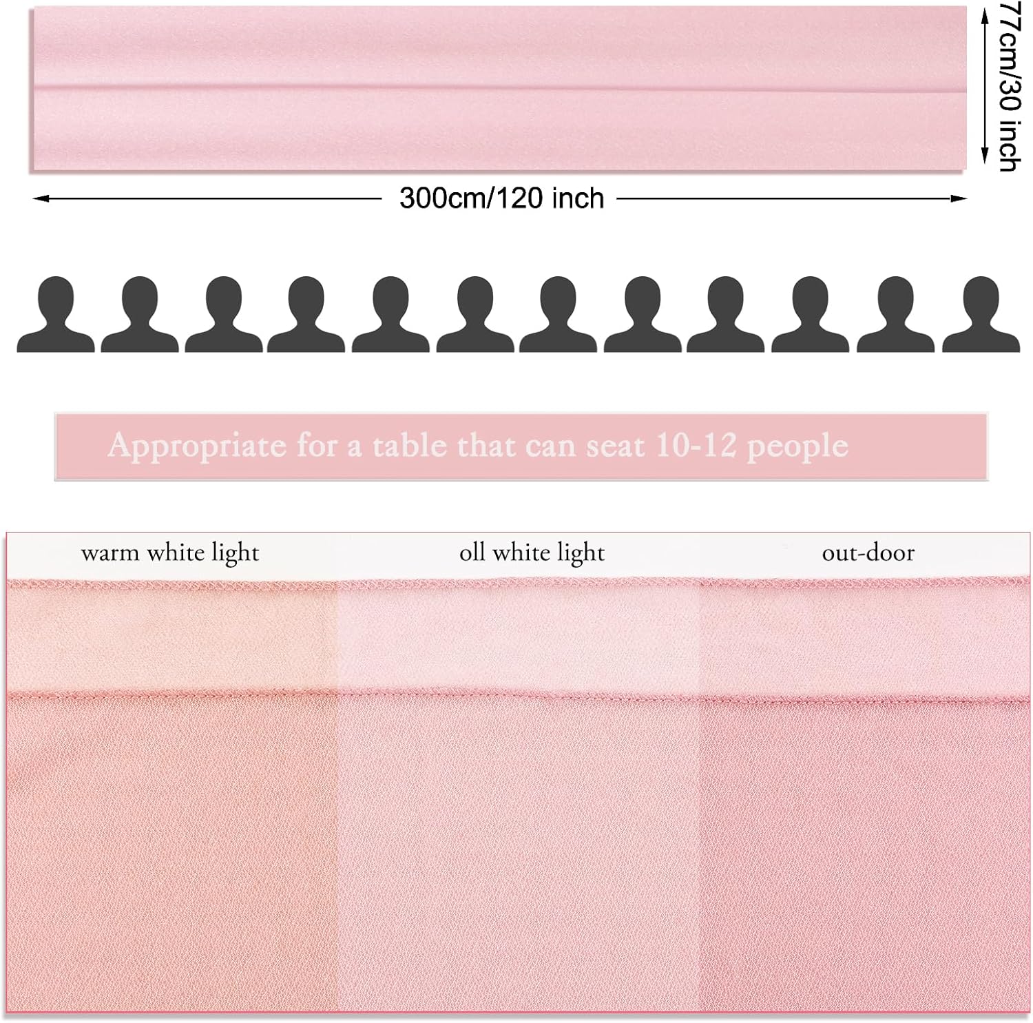 - Package: Pack of 1 chiffon table runner, Size: 30" W x 120" L,about 10Ft ,comes with 2 white ribbons.which is large enough to cover rectangles and round tables, can also be spliced together for long tables. The rustic table linen with gorgeous finished edges drapes gracefully across long, round or other tables.
