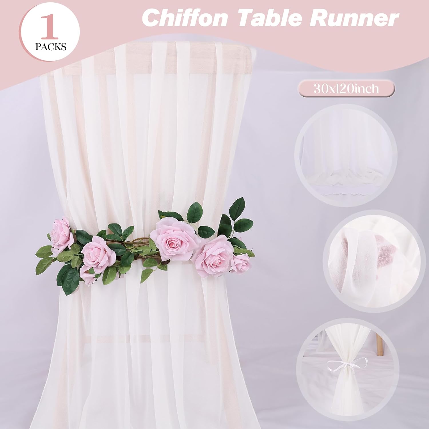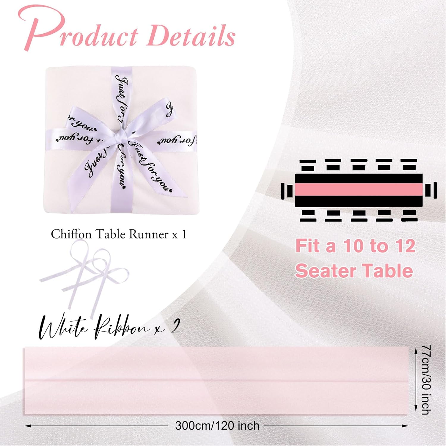 - Package: Pack of 1 chiffon table runner, Size: 30" W x 120" L,about 10Ft ,comes with 2 white ribbons.which is large enough to cover rectangles and round tables, can also be spliced together for long tables. The rustic table linen with gorgeous finished edges drapes gracefully across long, round or other tables.