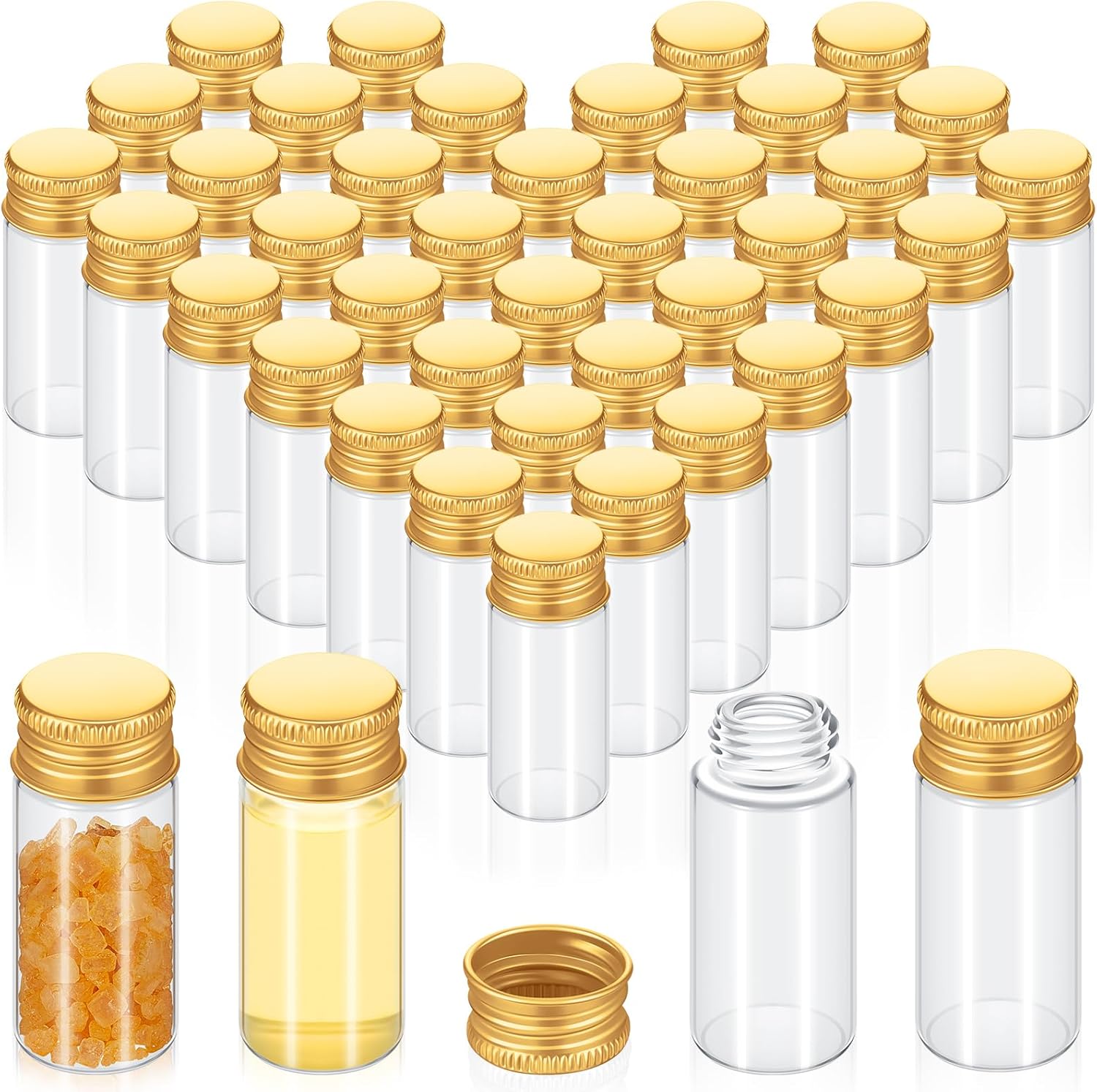 100 Pcs Small Clear Vials Spice Mini Jars with Lids Mini Glass Bottles with Screw Aluminum Metal Caps Tiny Jars Sample Containers for Powder Cream Cosmetic Jewelry Wedding(10 ml,Gold Caps)