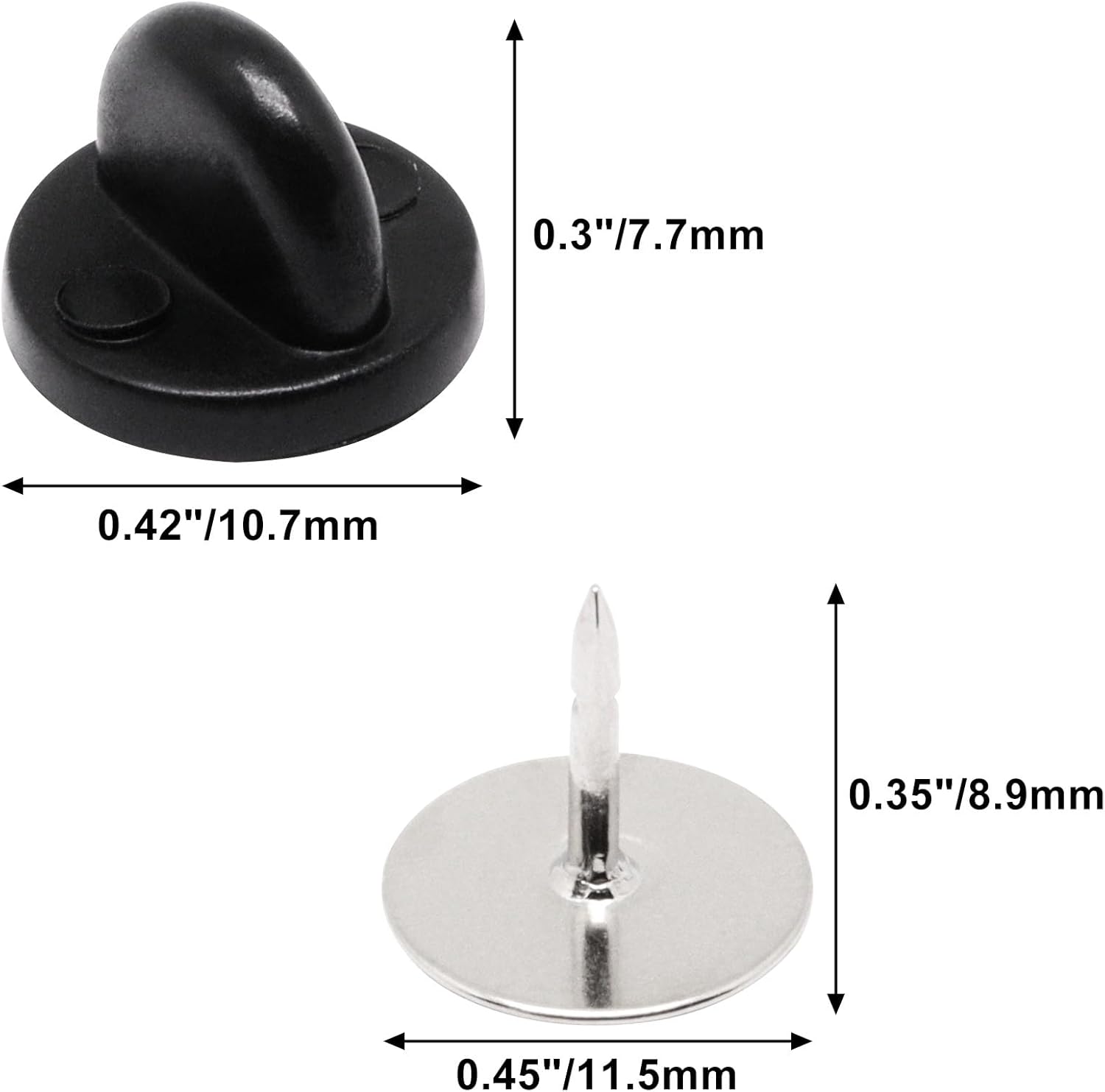 - Size: Rubber clutch backs diameter 10.7mm/0.42", 7.7mm/0.3inch in height; Pin backing diameter 11.7mm/0.45", 8.9mm/0.35" in height. Total 100set pin backs locking, meet your different uses for crafts.