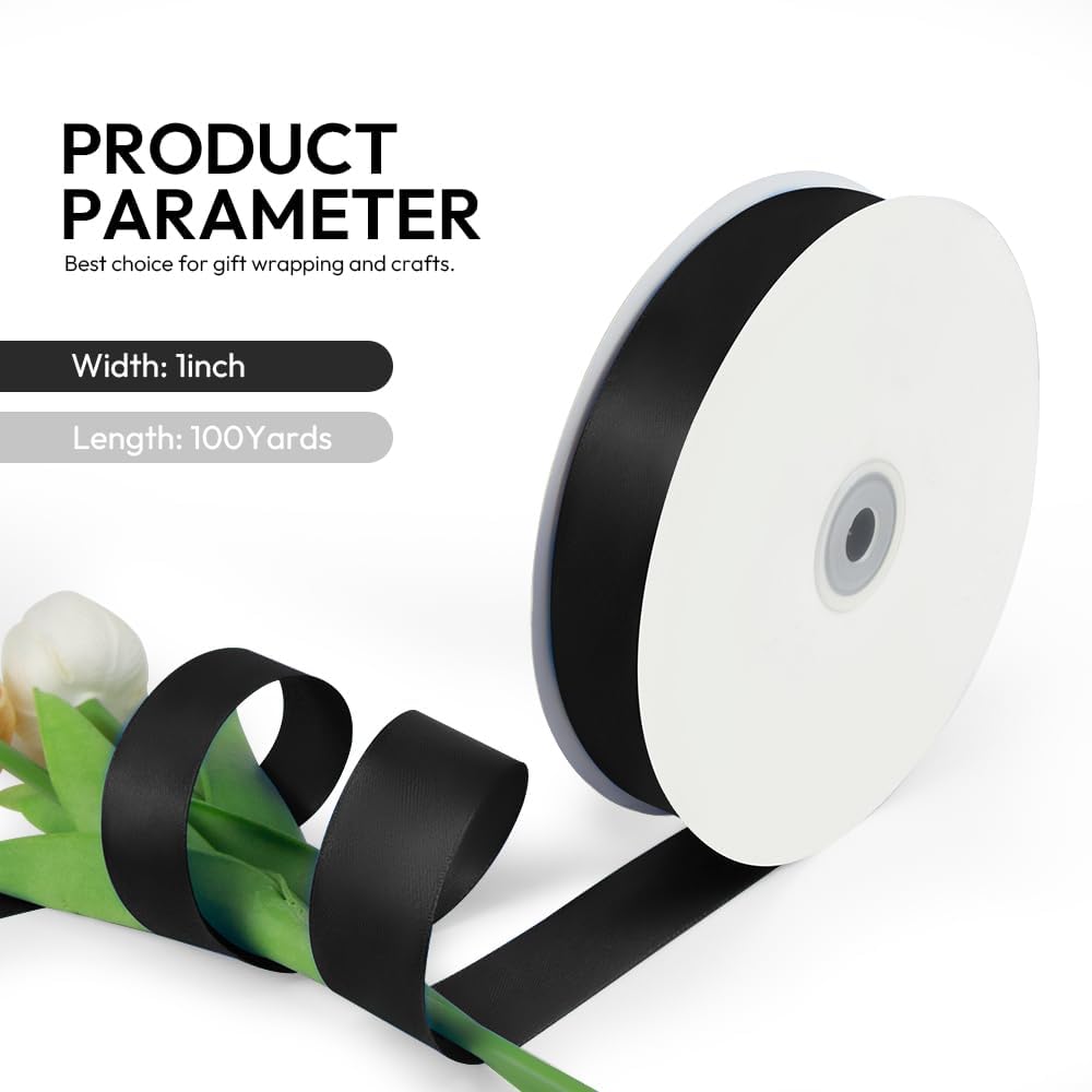 1 Inch 100 Yards Satin Ribbon Black, Solid Color Fabric Ribbon for Gift Wrapping, Wedding, Polyester Gift Ribbon for Birthday Party Decoration, Craft, Hair, Floral, Sewing