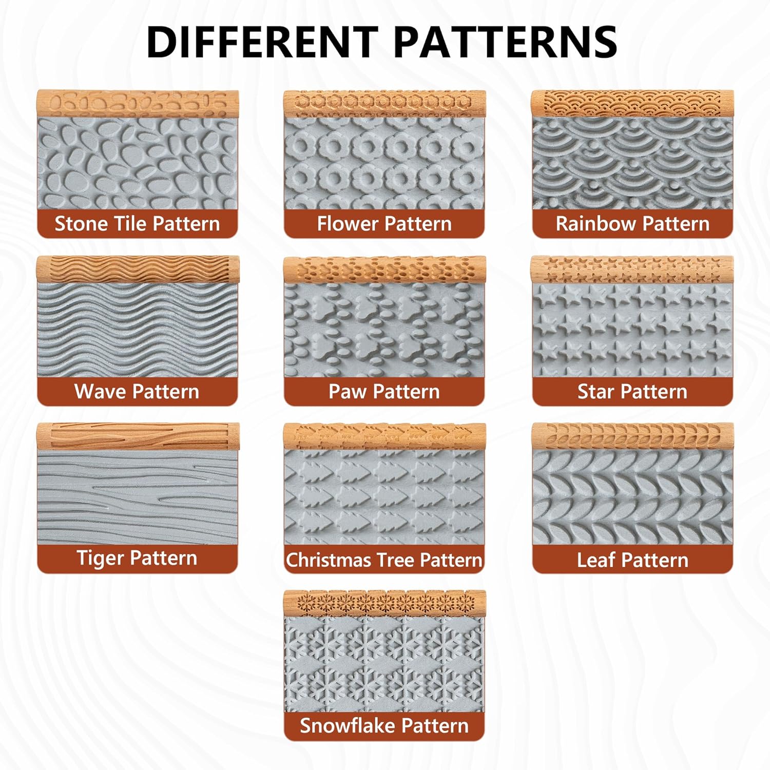 - LARGE PATTERN VARIETY Potterhyme's 10-piece clay texture rollers set offers a large variety of different patterns for you to choose from. Offering options for specific holidays, such as Christmas, as well as modeling patterns for everyday use