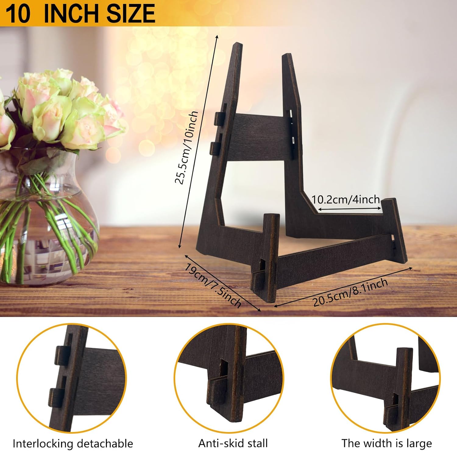 - PERFECT HOME DISPLAY STAND: The easel stand adopts a deepened design, which can display products of different thicknesses at the same time. The plate stands for display perfectly combines beautiful, practical, retro and other characteristics, with a high-grade brown appearance, can better embellish your room.
