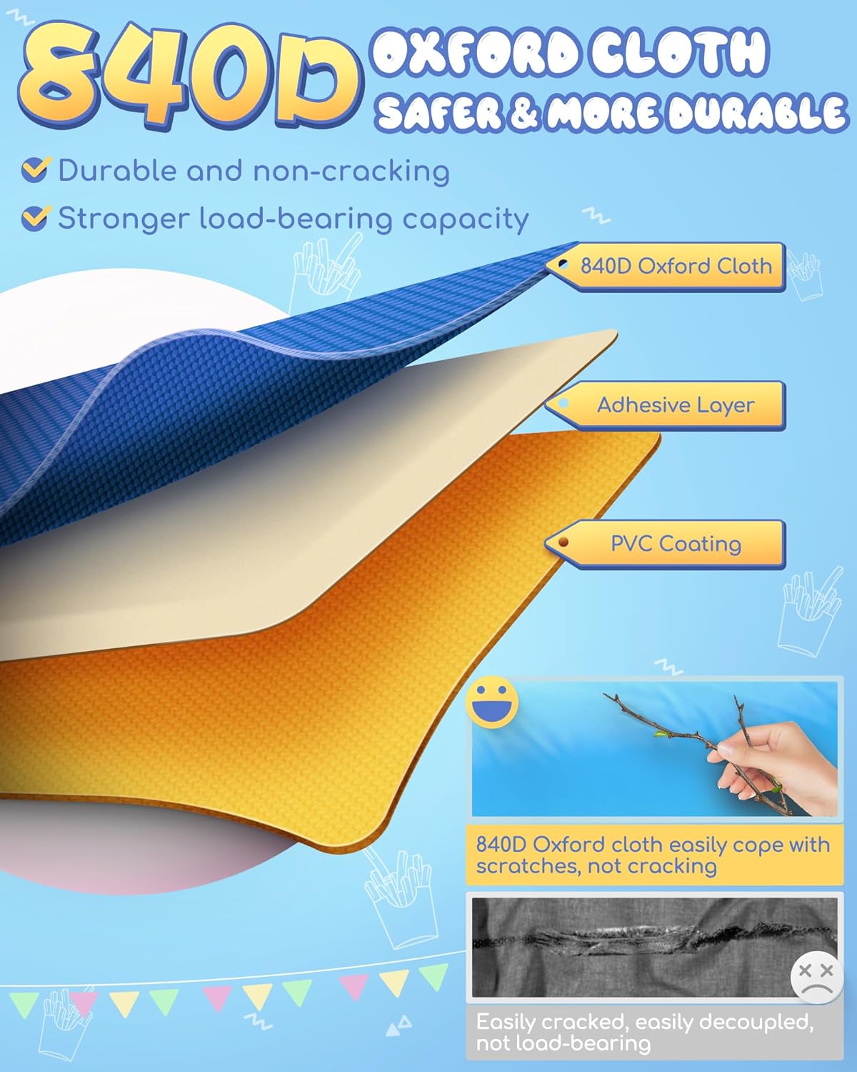 - 【Built for Durability】- Our inflatable bounce house, crafted from heavy duty 840D oxford, offer economical and long-lasting fun. With a weight capacity of up to 100 pounds per child, they can play longer as they grow. We also include two convenient fixes: a fix-it patch and direct stitching with thread.