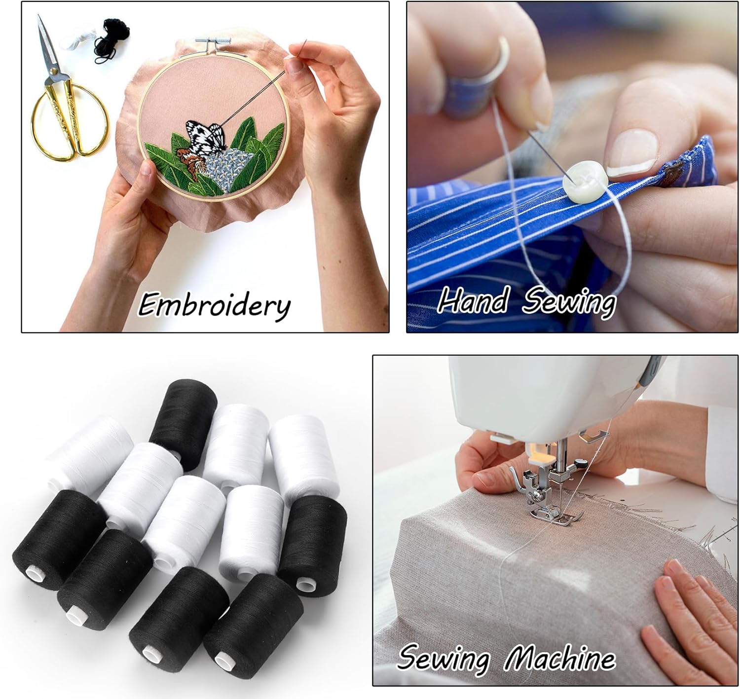 - 1000 Yards per Spools: This sewing string set offers 2 most popular thread colors, 6*black thread+ 6*white thread.