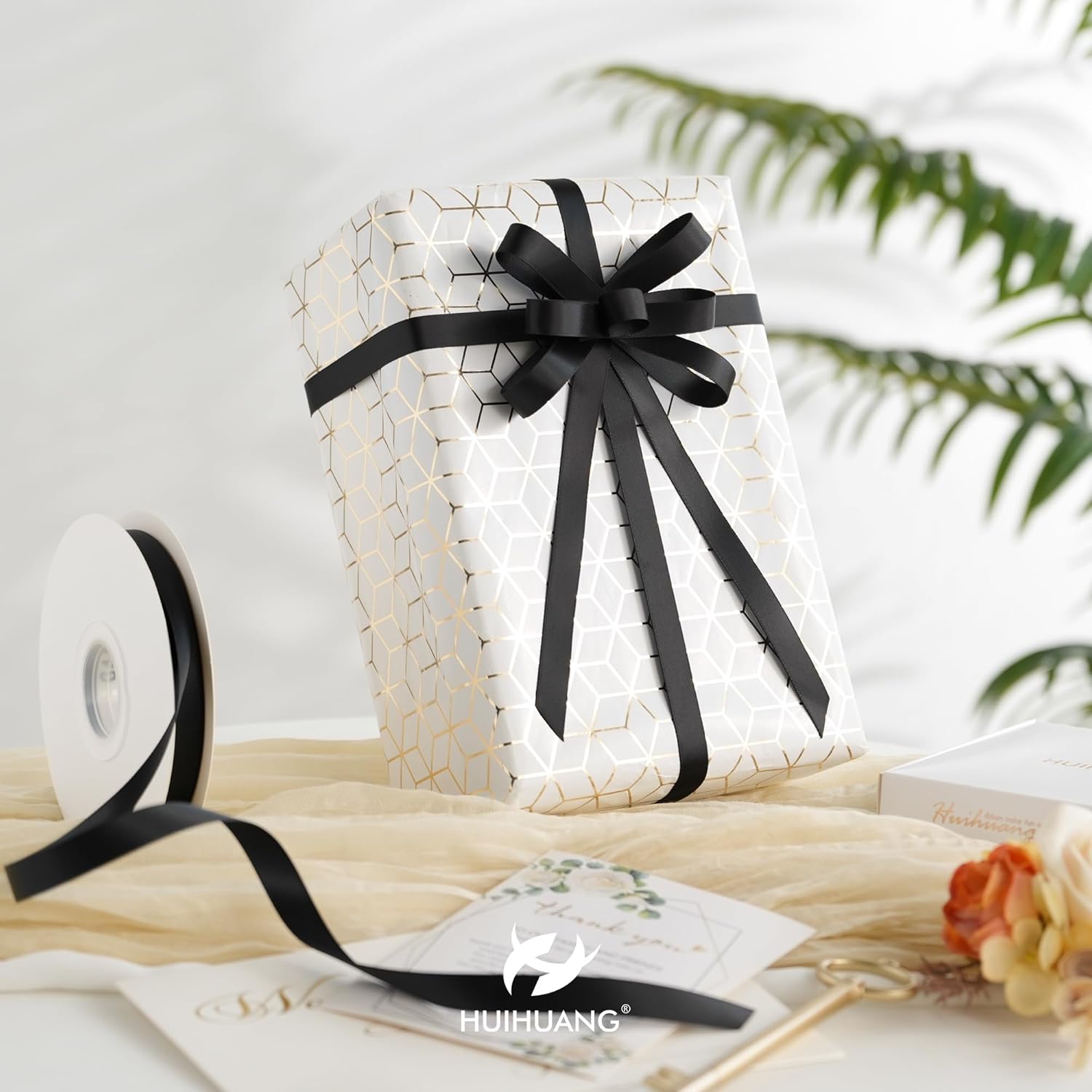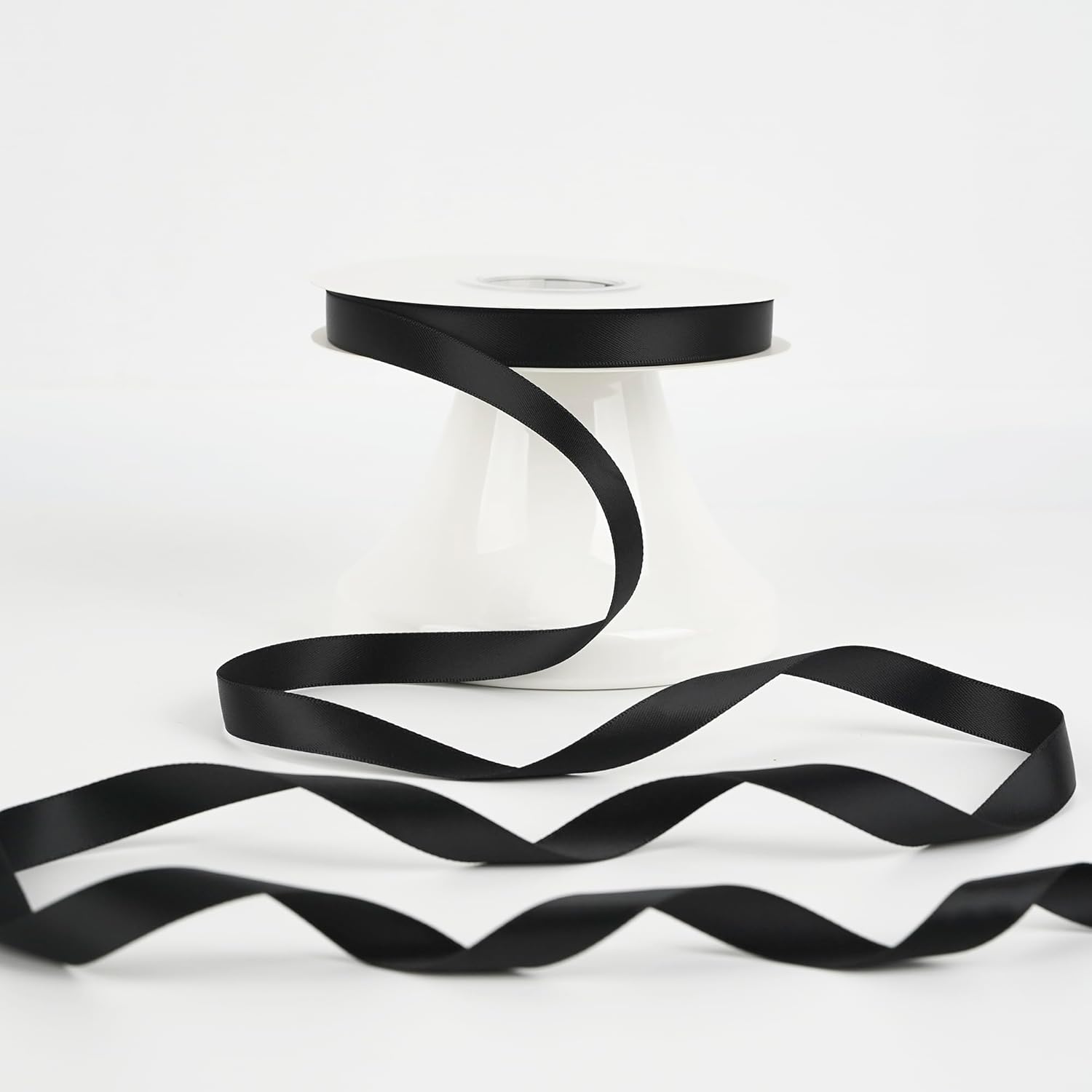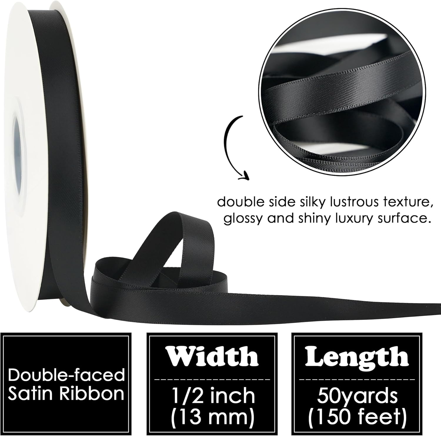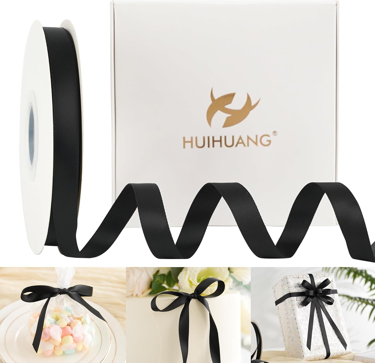 HUIHUANG Black Satin Ribbon 1/2 inch X 50 Yards Continuous, Black Double-Faced Satin Ribbon for Gift Wrapping, Bows, DIY Crafts, Flower Bouquet, Christmas Holiday Decor, Hair Bows