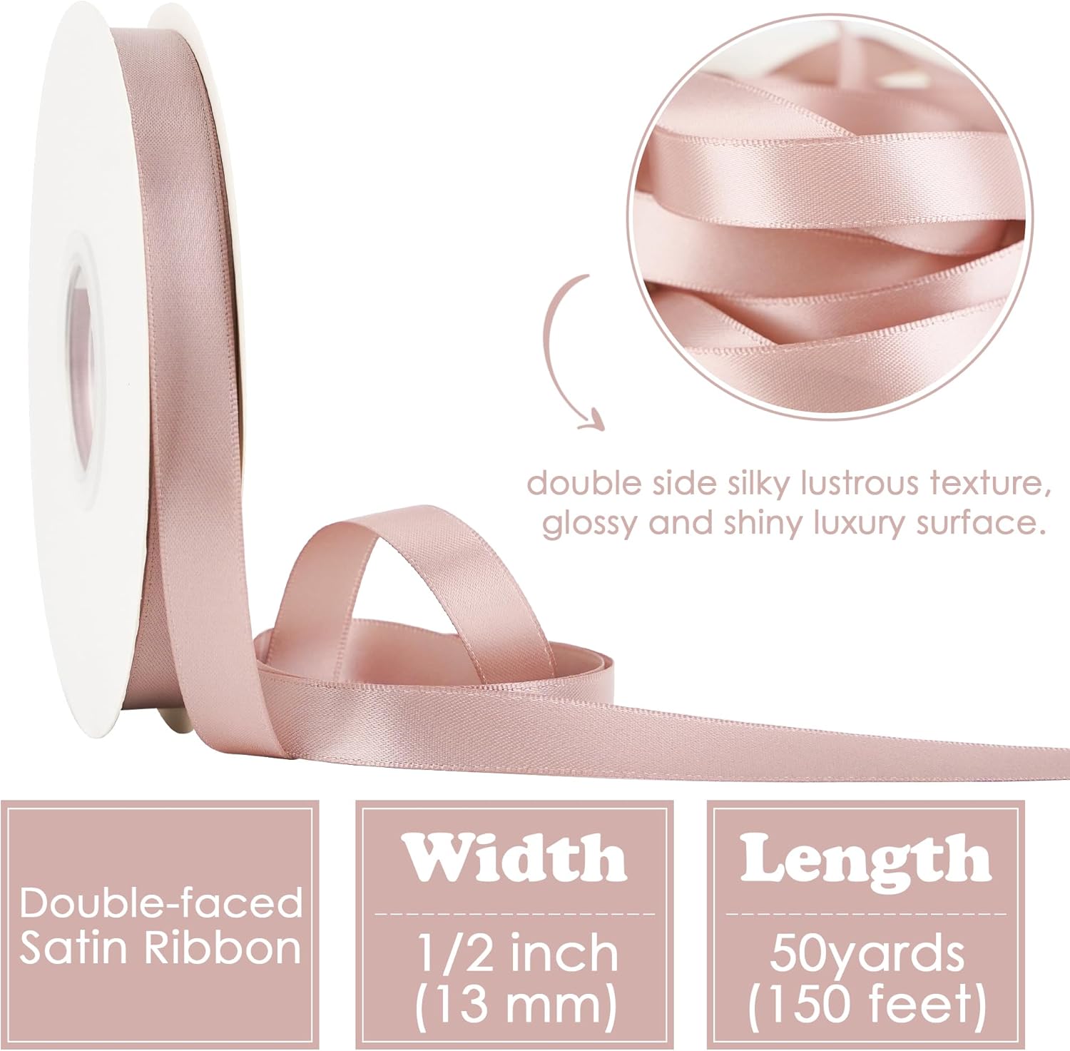 - Size: Dusty rose satin ribbon measures 1/2" wide and continuous 50 yards(150 feet) long in a complete roll in a paper box. Perfect size for various decorations and crafts