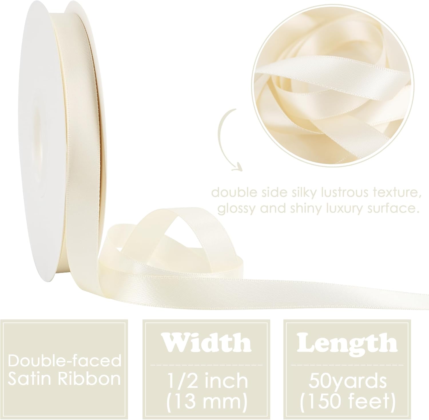 - Size: Ivory satin ribbon measures 1/2" wide and continuous 50 yards(150 feet) long in a complete roll in a paper box. Perfect size for various decorations and crafts