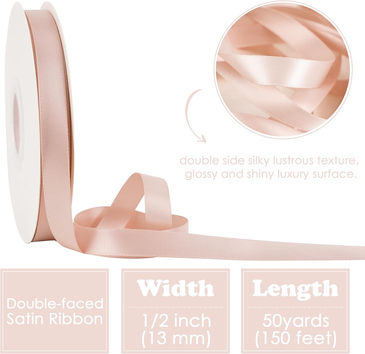 HUIHUANG Rose Gold Satin Ribbon 1/2 inch X 50 Yards Continuous, Rose Gold Pink Double-Faced Satin Ribbon for Gift Wrapping, Bows, DIY Crafts, Flower Bouquet, Wedding Decor, Christmas Decoration