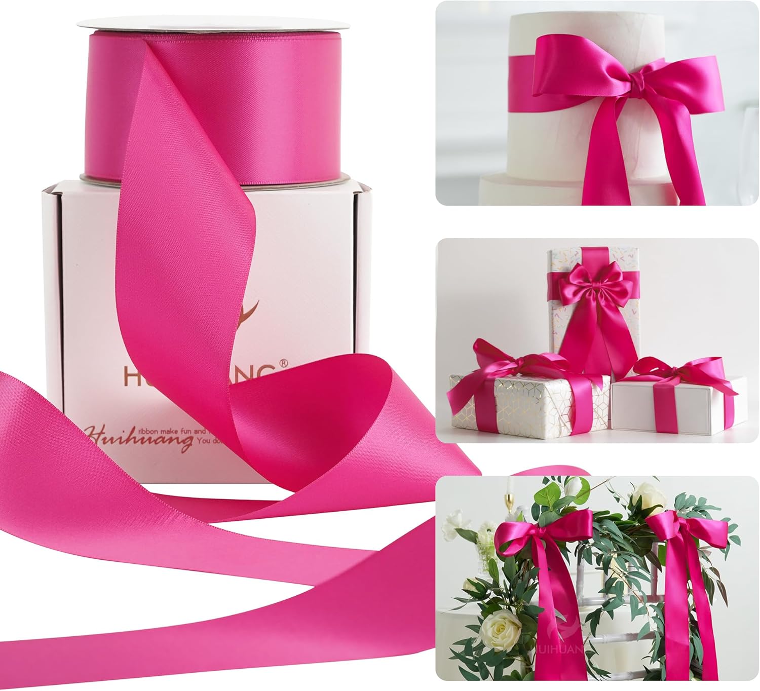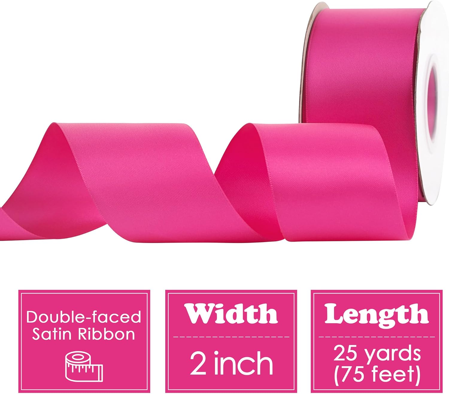 HUIHUANG Hot Pink Satin Ribbon - 2 inch Wide, Double Faced, Fuchsia - 25 Yards/Roll for Gift Wrapping, Bows Making, Flower Bouquet, DIY Crafts, Wedding, Bridal Shower, Holiday Party Decor