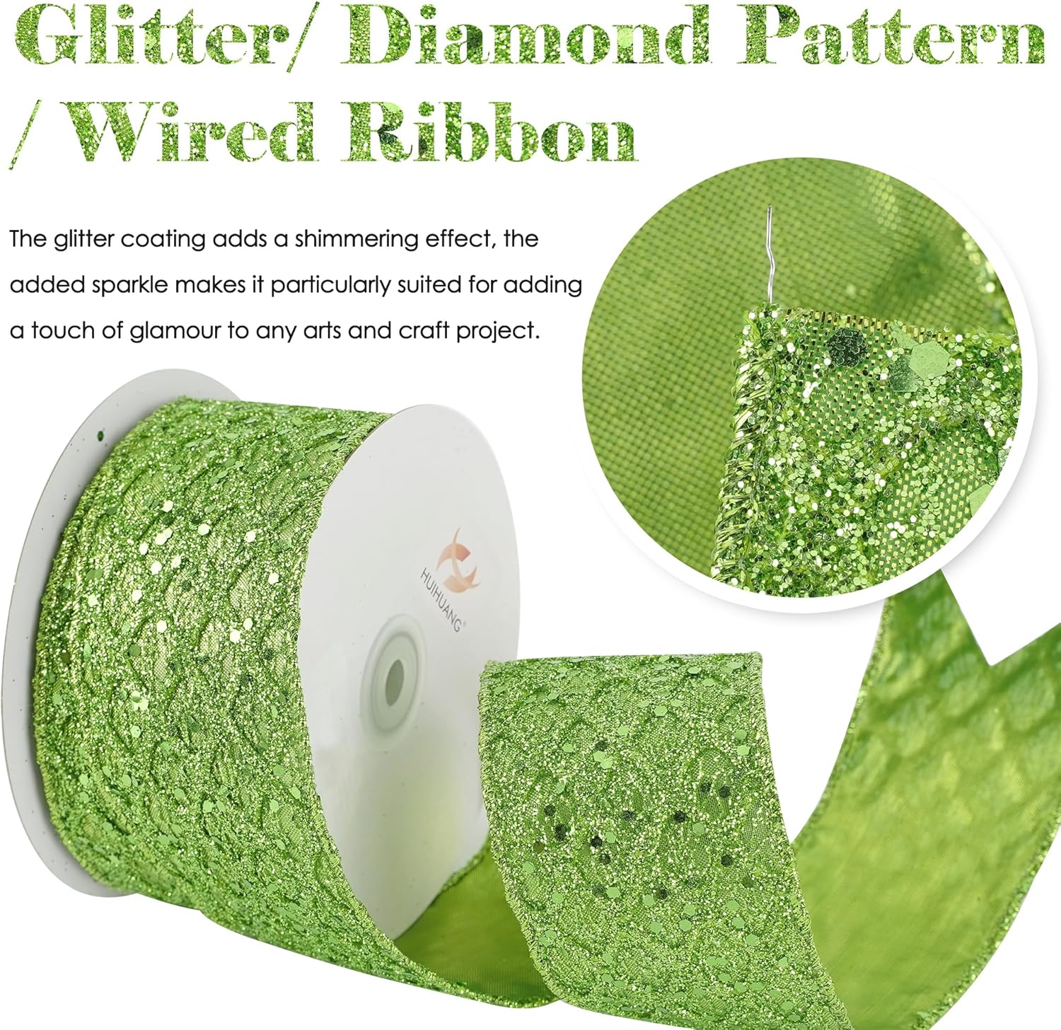 HUIHUANG Lime Green Wired Ribbon for Christmas Tree 2.5 inch Lime Green Glitter Diamond Mesh Ribbon for Tree Decoration, Wreaths, Garland, Gift Wrapping, Bows Making, Halloween Decor -10 Yards