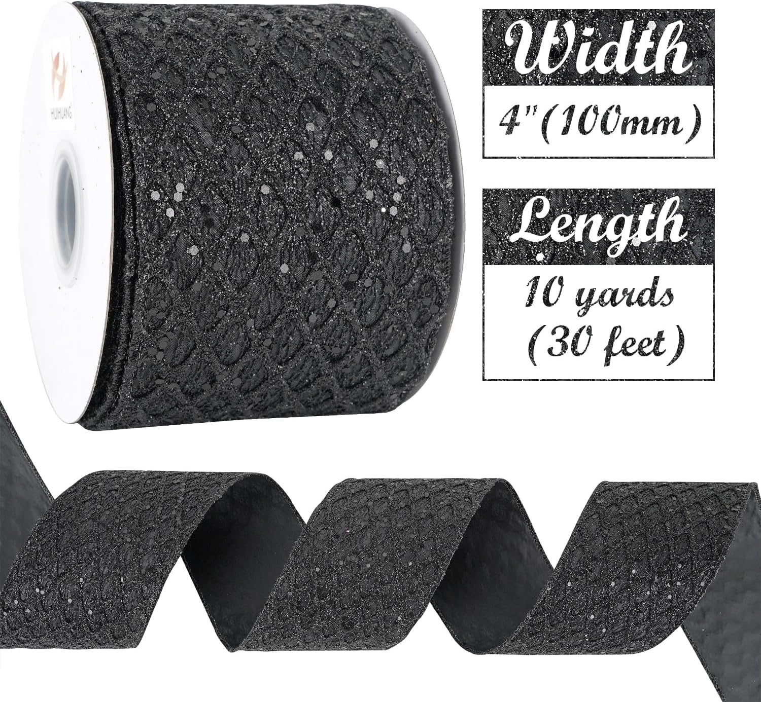 HUIHUANG Black Glitter Wired Ribbon 4 inch Black Christmas Tree Ribbon Diamond Mesh Wire Ribbon for Tree Decorations, Wreaths, Garland, Large Bows Making, Halloween Decor -10 Yards