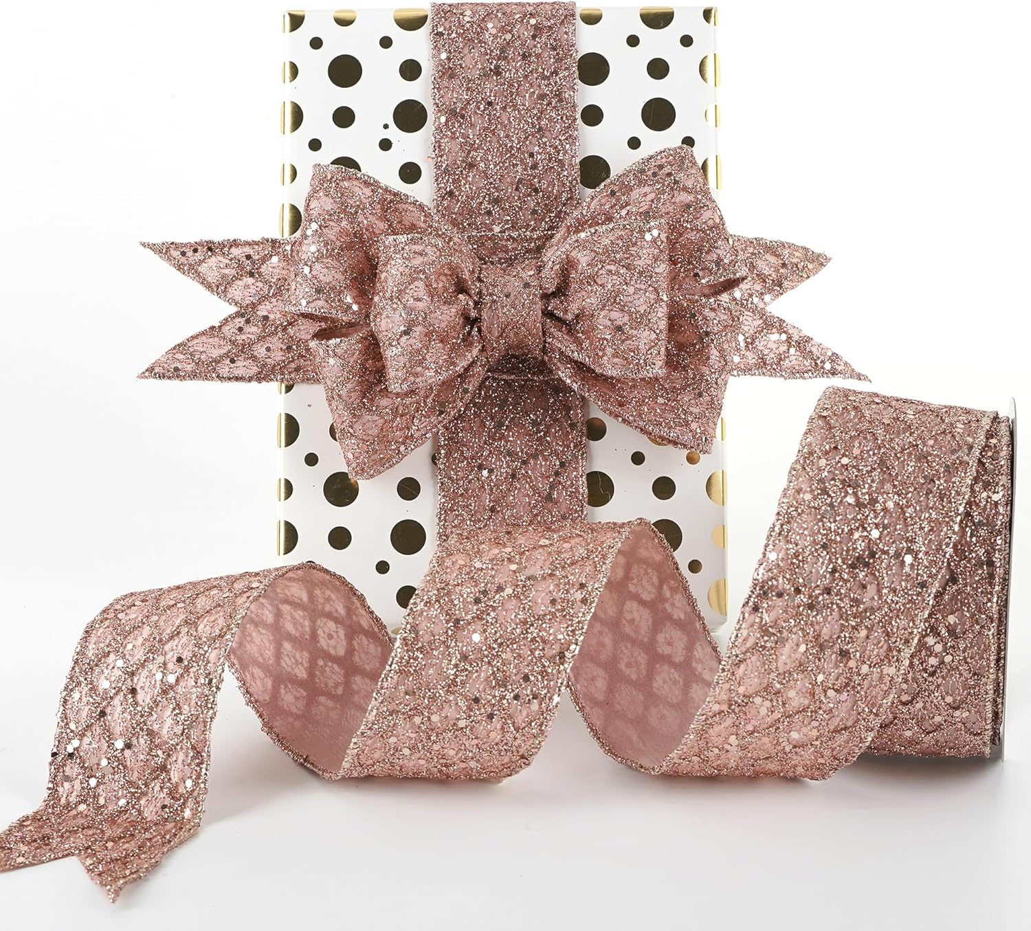 - Color: Rose gold glitter wired ribbon brings a bright and beautiful sparkly touchness to your decoration craft ideas and holiday gift wrapping, especially for Christmas tree decorations