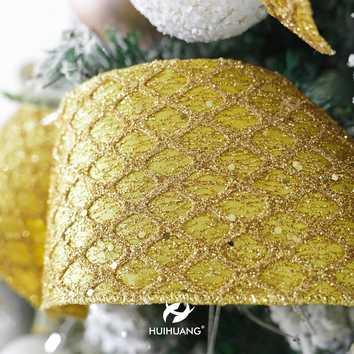 HUIHUANG Gold Glitter Wired Ribbon, 4 inch x 10 Yards, Polyester, Christmas, Gold, Geometric Pattern, Perfect for Tree Decorations, Wreaths, Gift Wrapping
