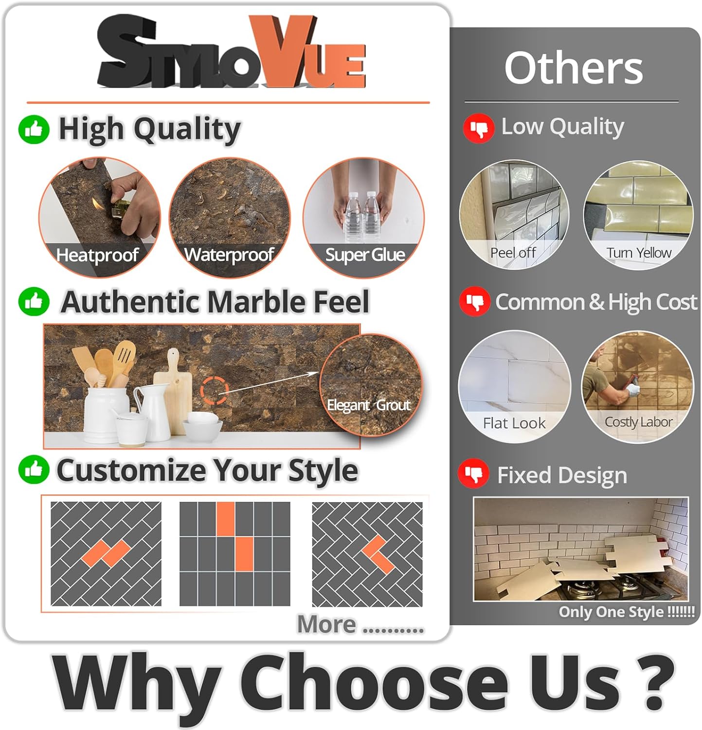 - ๐๐ฅ๐๐ฏ๐๐ญ๐ ๐๐จ๐ฎ๐ซ ๐๐ฉ๐๐๐: Featuring unique slot edges for a realistic grout-look, StyloVue self adhesive wall tiles offer an authentic design and texture that customers adore. Elevate the aesthetic of your space while simplifying maintenance and cleaning, without the hassle of traditional grouting.