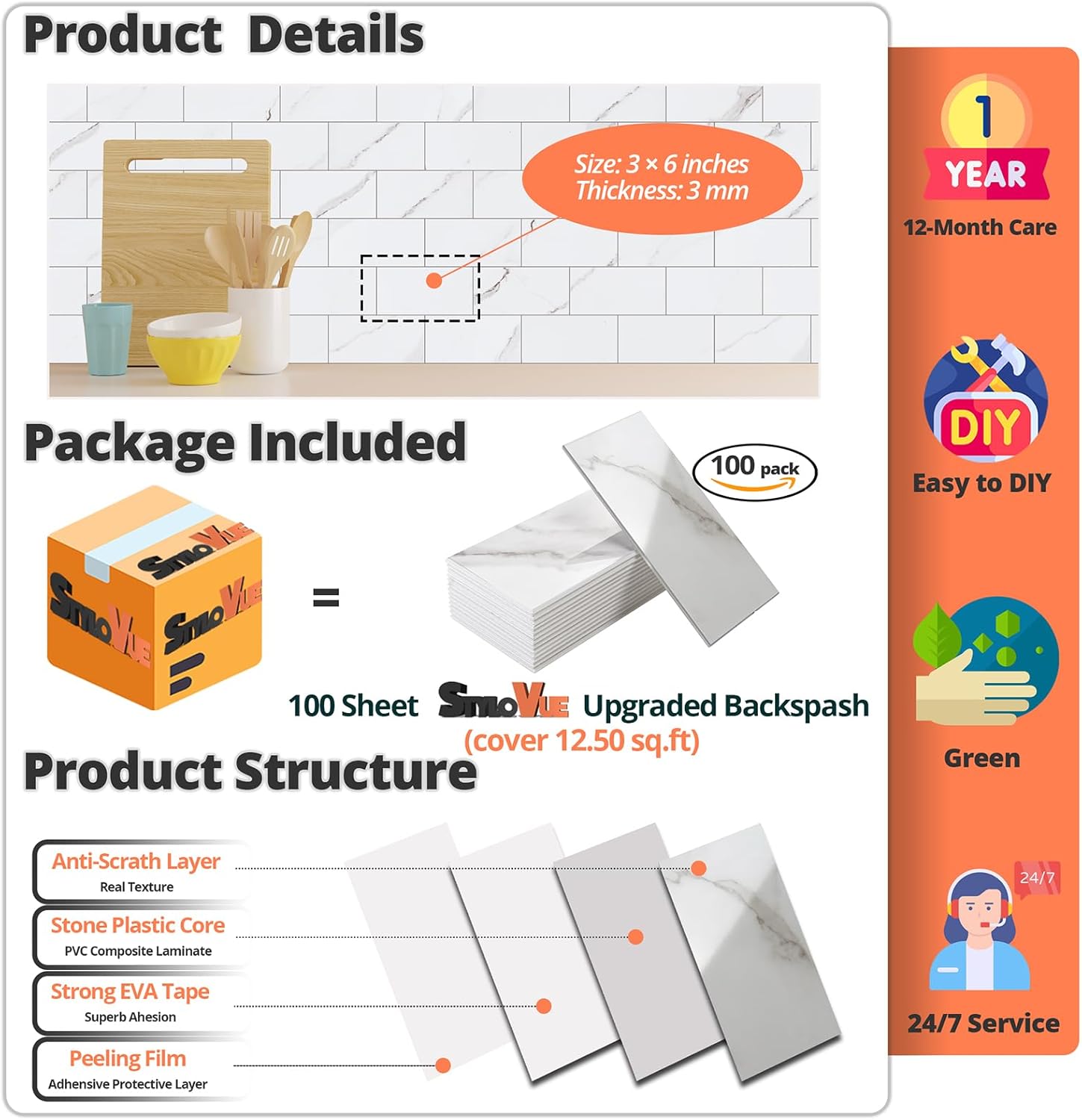 100 Pieces Peel and Stick Backsplash for Kitchen, 3" x 6" PVC Subway Tile 2025 Upgraded Glossy White Marble with White Grout Backsplash Stick on Tile Elevate Kitchen Fireplace RV