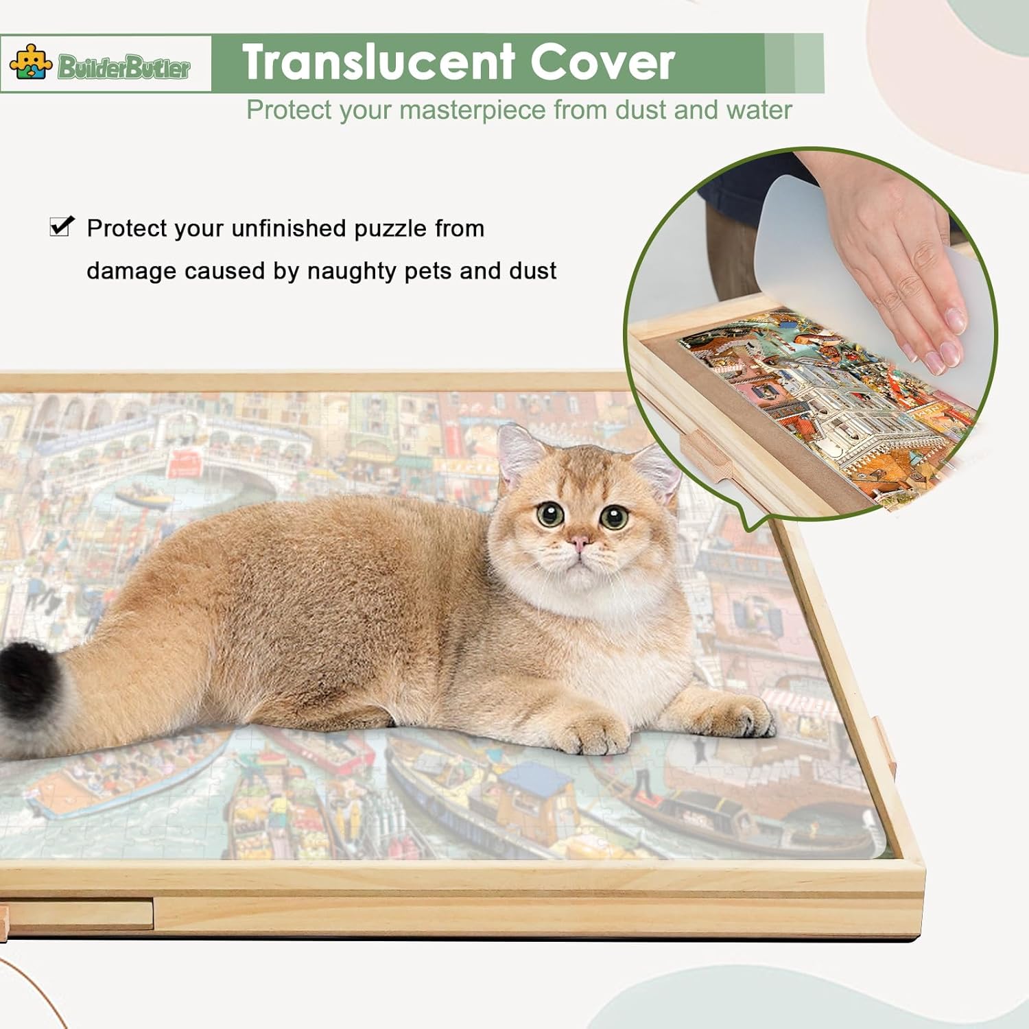 - 6 Drawers & Protective Cover: The BuilderButler puzzle board features six wooden drawers that allow you to efficiently sort and organize puzzle pieces by difference. Each drawer is equipped with secure handles to ensure they stay closed during transportation. The transparent protective cover shields your puzzle from dust, water, and curious pets, ensuring your puzzle remains undisturbed and protected between sessions, making your puzzling experience more enjoyable and organized.