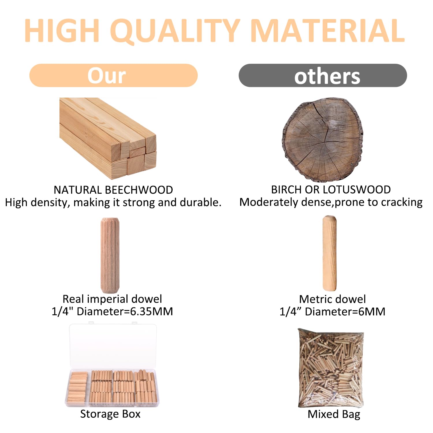 - HIGH QUALITY MATERIAL: Wood dowel pins are cut from beech wood high density. It is denser, harder and has better bending resistance than birch and lotus wood.Real imperial dowel, suitable for imperial drills, not metric.