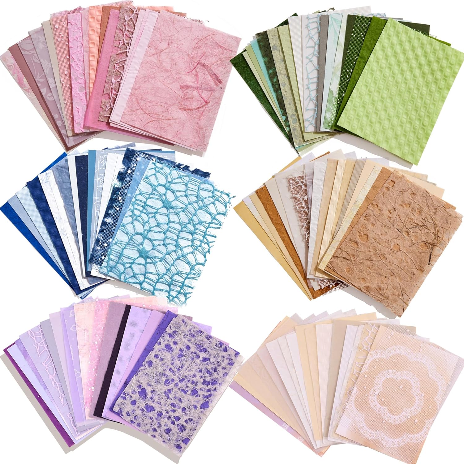 - VARIETY OF DESIGNS: Each package comes with 6 pack, 108 pieces assorted textured paper and mesh fabric in various colors, textures and materials.