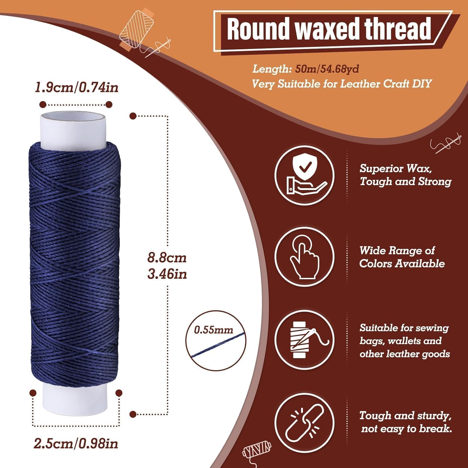- Waxed Thread for Leather: 0.55 mm thick, 54 yards per spool, leather sewing thread made from braided polyester, the amount of wax on the cord is moderate and easy to handle, Multi-strand woven round waxed thread strong, wear-resistant, and waterproof, ideal for leather sewing, stitching, braiding, knotting, beading, binding, necklace and bracelet making