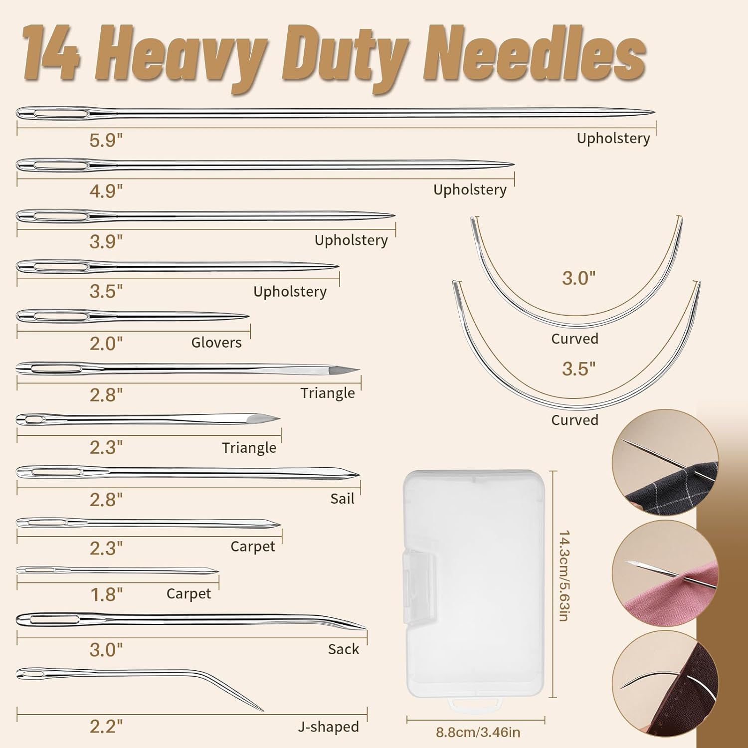 - Package Includes: Our upholstery repair kit includes high-quality round waxed thread, 14 different types of heavy-duty needles, 2 thimbles, a seam ripper and needle threaders, basic instructions and a portable storage case