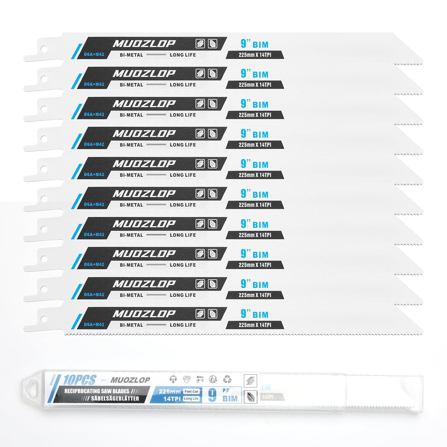 10 Pack 9 inch Reciprocating Saw Blades Set,14 TPI High Carbon Saw Blades, Metal Saw Blades with Organizer Case (10, 14TPI/225mm)
