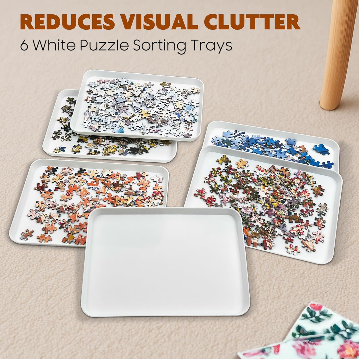 - 【6 Puzzle Sorting Trays Stackable】With six specially designed puzzle piece sorter trays, you can easily group your puzzle pieces by color, pattern, or shape! Whether you're organizing edge pieces or selecting specific patterns or color blocks, it becomes simple and efficient. The stackable design helps save space when puzzling alone and makes it even easier when you're working on puzzles with family and friends