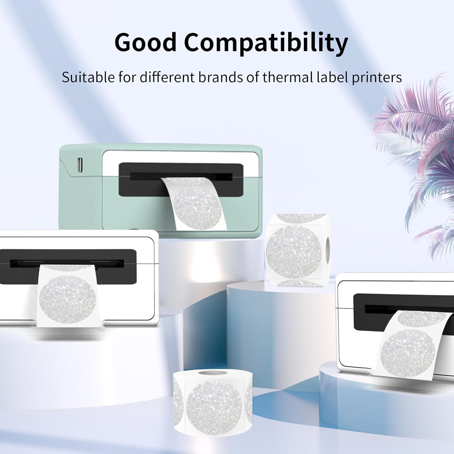 - Package: Circle Holographic Glitter Silver Thermal Sticker Labels 1.5", 350 Labels/Roll. It’s printable with a thermal printer, No ink toner or ribbons are needed