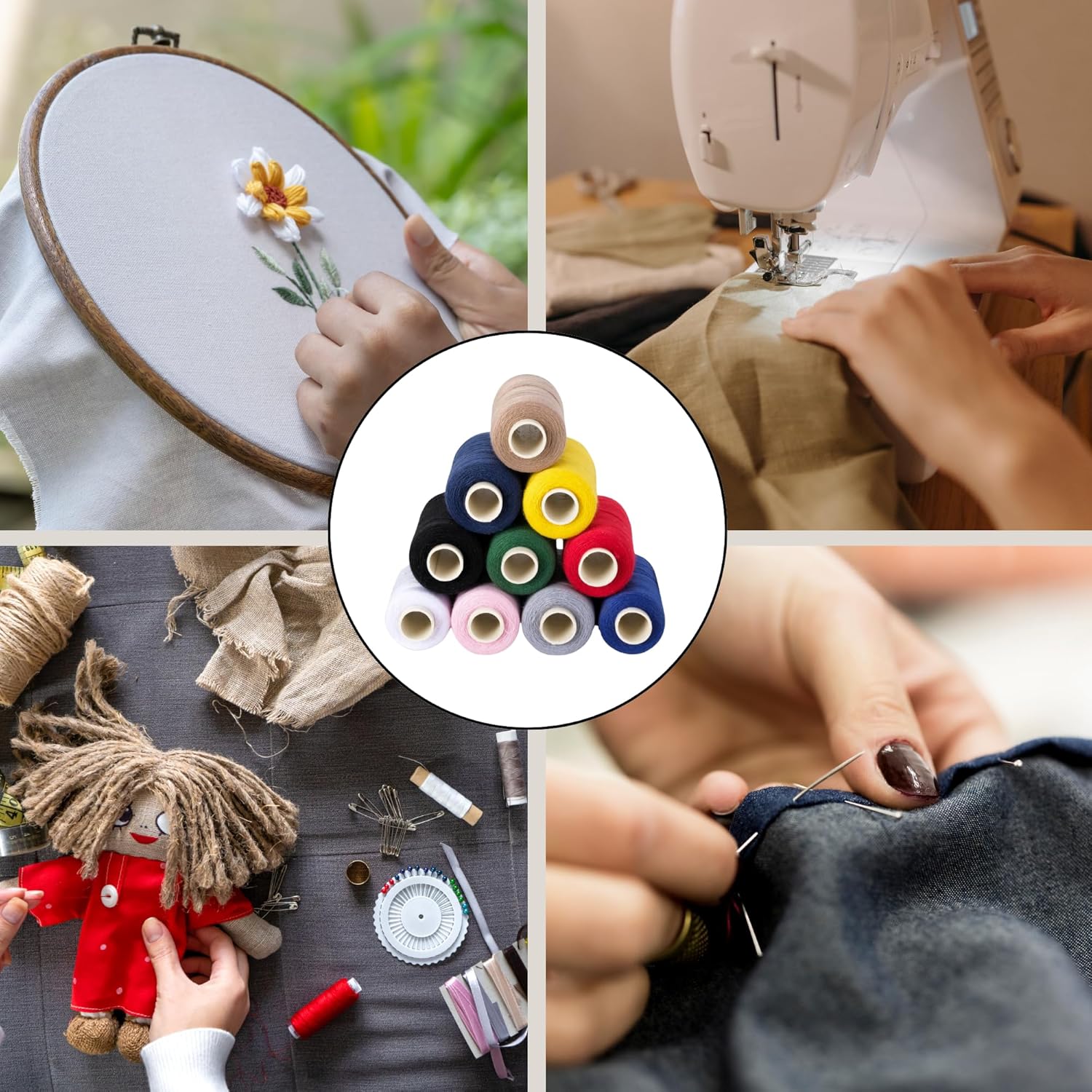 - 10 Vibrant Colored Thread Cones β Perfect for All Sewing Projects This set includes 10 spools of high-quality sewing thread, each with 500 yards of durable and strong thread. The assortment of vibrant colors allows you to match your thread with various fabrics, whether you're working on quilting, serging, embroidery, or general sewing. Designed for both hand and machine sewing, these threads glide smoothly through fabric without tangling or breaking.