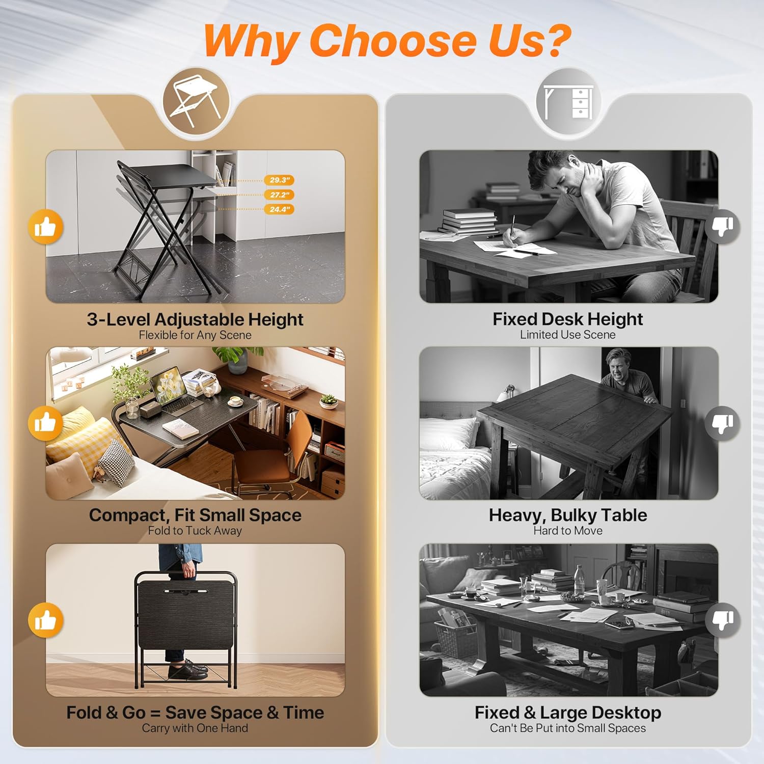 - 【Sturdy & Durable Build】Strong steel frame, adjustable feet, and cross-leg design of the portable folding desk provide exceptional stability. The water-resistant, scratch-resistant tabletop blends seamlessly with any home decor — perfect for bedrooms, apartments, RVs, offices, and more