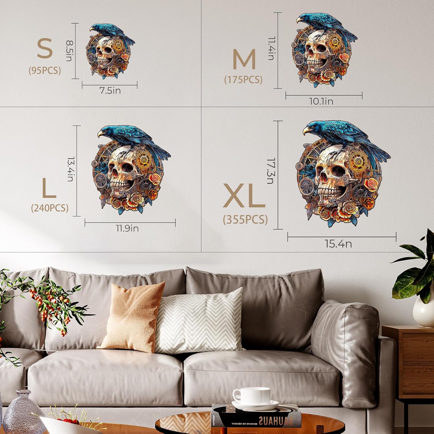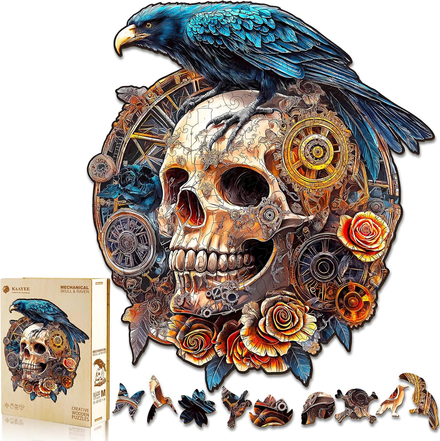 KAAYEE Wooden Puzzles for Adults, 3D Visual Effect Raven & Mechanical Skull Wooden Jigsaw Puzzle Unique Shape Wood Puzzle Adult, 3D Effect Flat Puzzle Birthday Family Games (S-8.5 * 7.5in-95pcs)