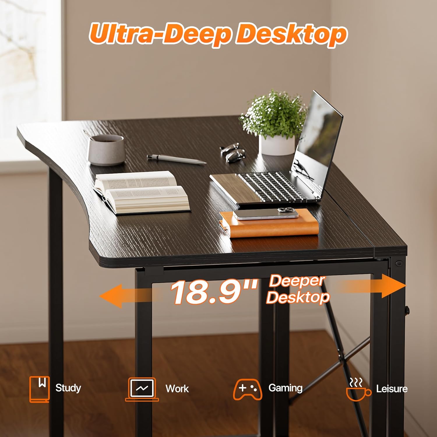 - ă18.9 Inch Deeper DesktopăDeeper desktop of the foldable office desk offer more space for laptop, notes and books... Sturdy 18mm thick steel legs and X-frame support make this home office desk stay rock-solid, less wobbling here. Say goodbye to sharp edges! The smooth, body-friendly curved desktop eases your hands, providing a more comfortable experience whether youâre working, studying, or doing makeup