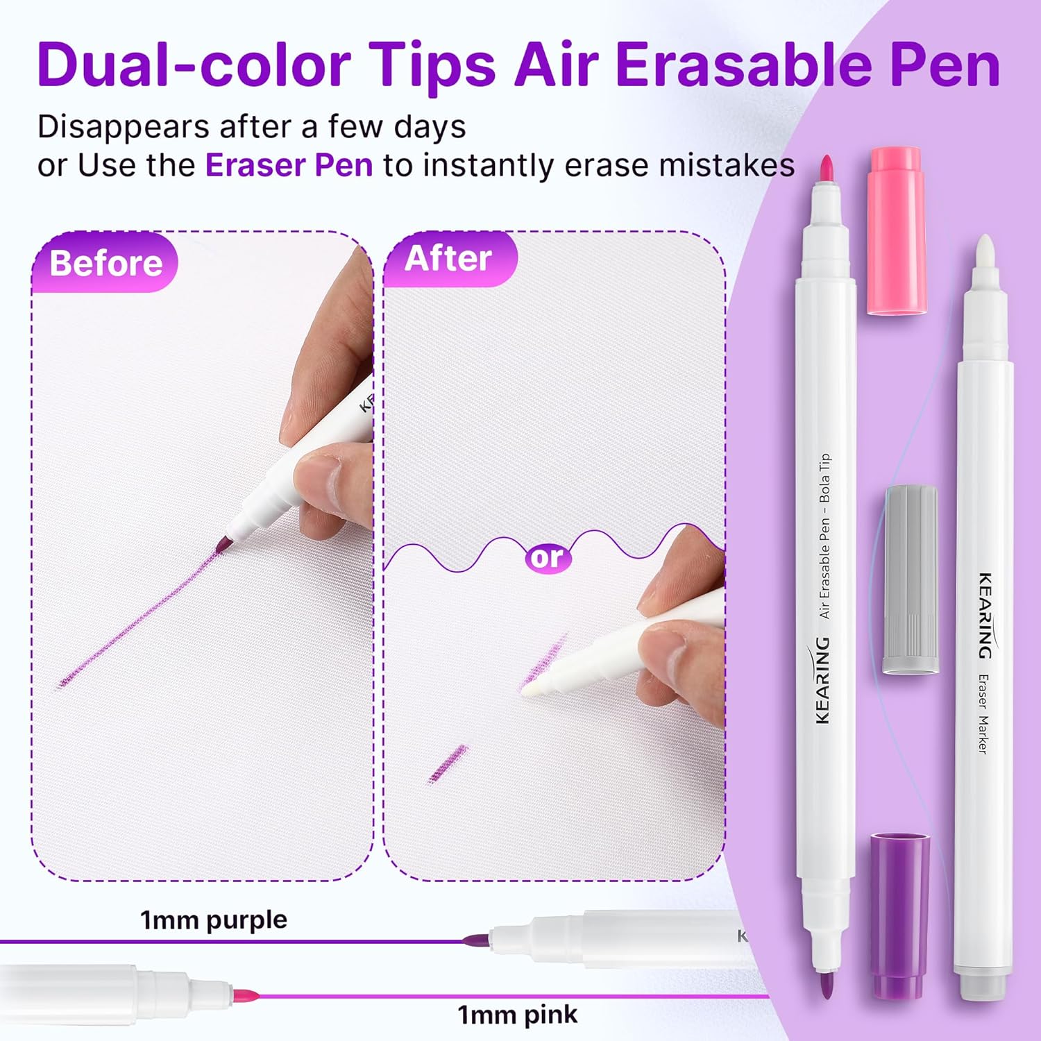 - Air Erasable: Our air erasable pens feature purple and pink ink for easy distinction between cutting lines, stitch guides, and alignment marks, no confusion! Marks fade naturally within hours, or use the included eraser pen for instant removal, saving time so you can focus on creating