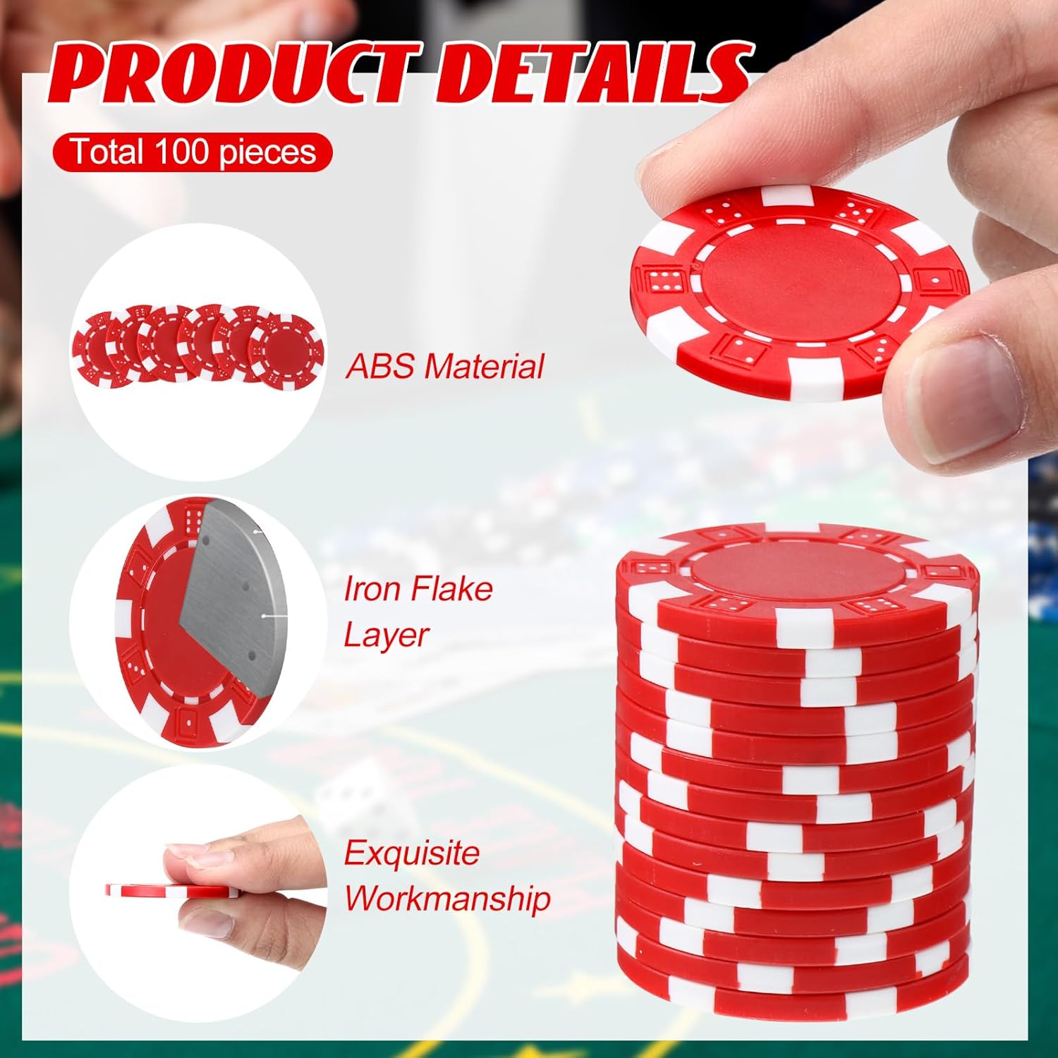 - Complete Set for Diverse Gaming Needs: This package includes 100 pieces of 11.5 gram red poker chips, providing an ample supply for various card games