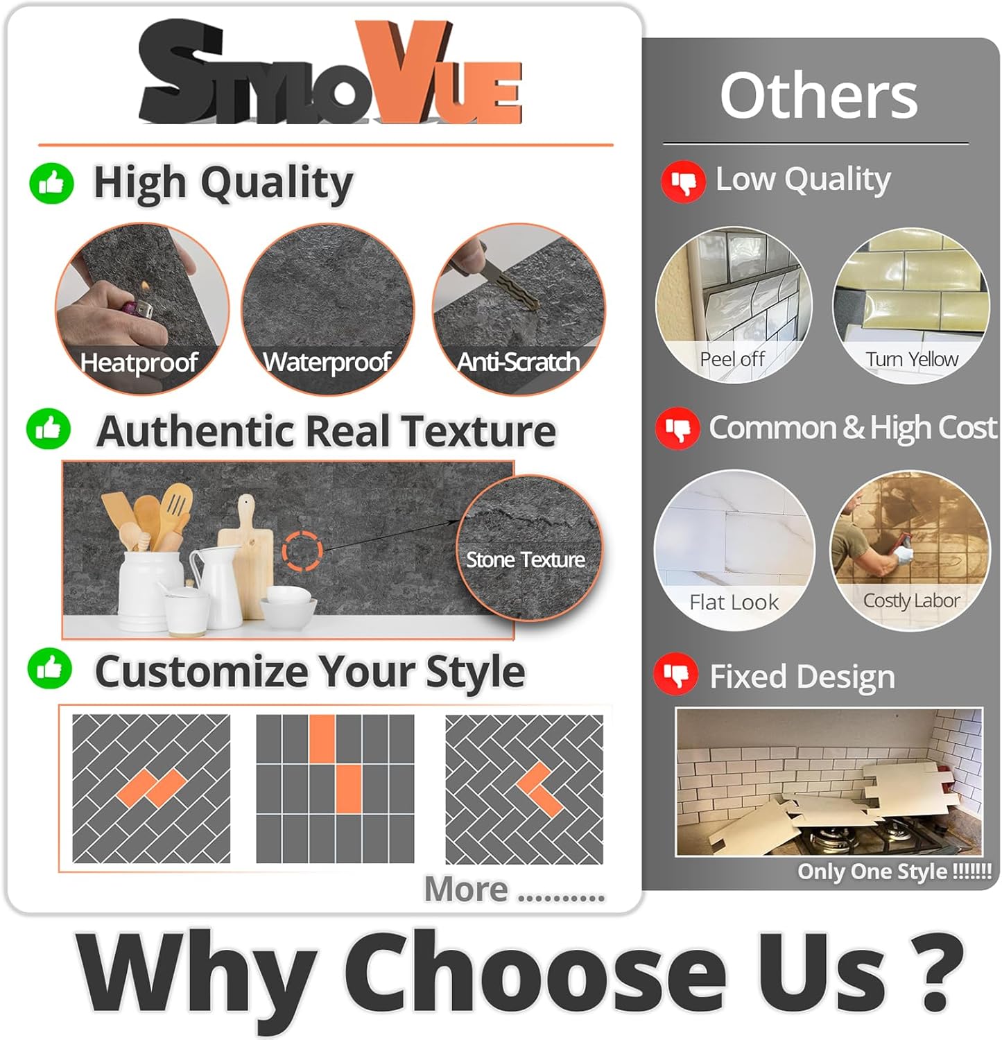 - ๐๐ฅ๐๐ฏ๐๐ญ๐ ๐๐จ๐ฎ๐ซ ๐๐ฉ๐๐๐: Featuring unique slot edges for a realistic grout-look, StyloVue self adhesive wall tiles offer an authentic design and texture that customers adore. Elevate the aesthetic of your space while simplifying maintenance and cleaning, without the hassle of traditional grouting.