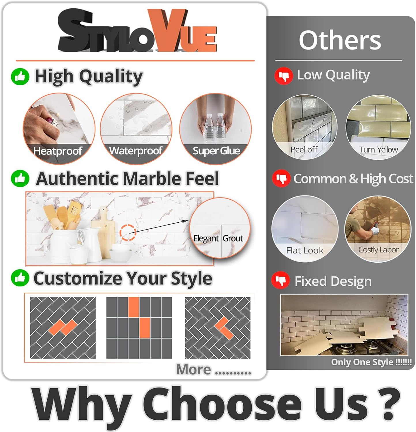 - ๐๐ฅ๐๐ฏ๐๐ญ๐ ๐๐จ๐ฎ๐ซ ๐๐ฉ๐๐๐: Featuring unique slot edges for a realistic grout-look, StyloVue self adhesive wall tiles offer an authentic design and texture that customers adore. Elevate the aesthetic of your space while simplifying maintenance and cleaning, without the hassle of traditional grouting.